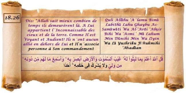 | C'est parce qu'Allah n'associe personne dans sa loi, sa décision ou son commandement, (18:26) Il n'implique personne dans Son ordre, son commandement, sa décision ou sa loi. |