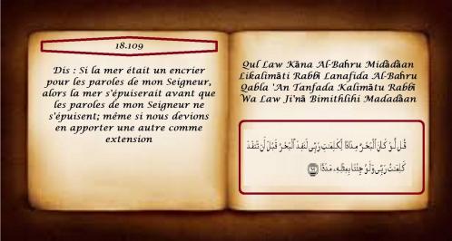 Veuillez regarder les paroles d'Allah révélées dans ce verset, utilisez la grammaire et les dictionnaires et comprenez correctement ce verset en gardant à l'esprit qu'Allah ne manque pas de mots (18:109) Dis : Si la mer était un encrier pour les paroles de mon Seigneur, alors la mer s'épuiserait avant que les paroles de mon Seigneur ne s'épuisent; même si nous devions en apporter une autre comme extension).
