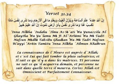 En effet, Allah [seul] a la connaissance de l'Heure et fait tomber la pluie et sait ce qu'il y a dans les matrices / utérus. Et aucune âme ne sait ce qu'elle acquerra demain, et aucune âme ne perçoit dans quelle terre elle mourra. En effet, Allah est Omniscient et Connaissant.